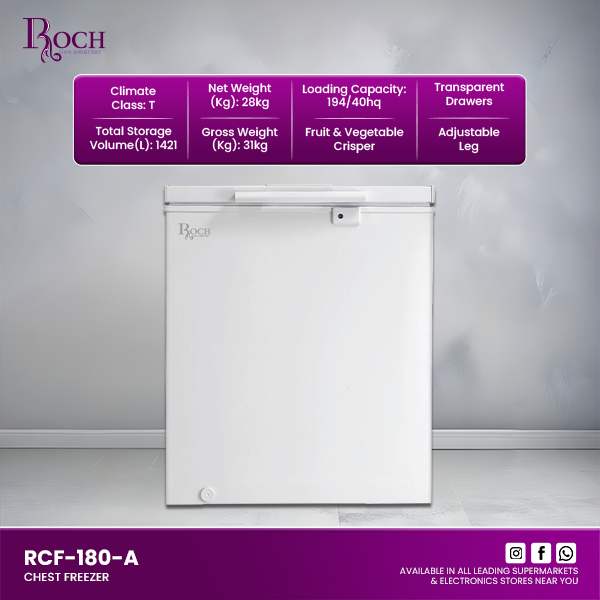 Discover the perfect blend of efficiency and convenience with the ROCH Chest Freezer 142 L (RCF-180-A). This compact yet spacious freezer is designed to meet your storage needs while complementing your lifestyle seamlessly. Ideal for any home or small business, this ... freezer boasts a generous total storage volume of 142 liters, ensuring ample space for your frozen goods. Its dimensions of 730mm width, 523mm depth, and 850mm height make it a versatile choice, fitting snugly into any corner of your kitchen or pantry. Equipped with transparent drawers and a dedicated fruit and vegetable crisper, organizing your frozen items has never been easier. The adjustable legs provide stability on any surface, while the robust construction ensures durability for years to come. Rated for climate class T, this freezer operates efficiently on a voltage of 220-240V and a frequency of 50Hz. With a net weight of 28kg and a loading capacity of 194 units per 40HQ, it combines practicality with energy efficiency, making it an essential addition to your home appliances. Upgrade your freezing capabilities with the ROCH Chest Freezer 142 L (RCF-180-A) and experience convenience like never before. Perfect for storing a variety of frozen foods while maintaining optimal freshness and accessibility. Transform your kitchen with the ROCH Chest Freezer 142 L (RCF-180-A) today.Read more