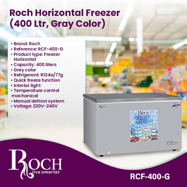 Discover the Roch Horizontal Freezer in a stylish gray color, designed to provide generous storage space and efficient freezing capabilities for your home or business. With an impressive 400 liter capacity, this freezer provides ample space to store a wide ... variety of frozen foods, ensuring you always have your favorite items within reach. The Roch RCF-400 model- G is equipped with a quick freeze function, allowing you to quickly freeze newly added items and preserve their freshness and flavor. The interior light illuminates the freezer compartment, making it easy to find and access your stored products, even in low-light environments. Featuring a mechanical temperature control, this chest freezer allows you to easily adjust temperature settings according to your preferences, ensuring optimal storage conditions for your frozen foods. The manual defrost system simplifies maintenance, making it easier to clean and keep your freezer running smoothly. With a voltage range of 220V-240V, the Roch Horizontal Freezer is suitable for most homes and businesses, offering reliable performance day after day. Additionally, the freezer uses environmentally friendly R134a refrigerant, minimizing its impact on the environment. Backed by a 12-month warranty, you can trust the quality and durability of the Roch Horizontal Freezer . Whether you need additional freezer space for your home kitchen, retail store or restaurant, this freezer is the perfect solution for storing your food and keeping it fresh for longer periods of time. Enhance your freezing capacities with the Roch Horizontal Freezer (400 L, Gray Color) and benefit from practical storage and easy access to your frozen products. With its user-friendly features and reliable performance, this freezer is sure to meet your freezing needs with ease and efficiency.Read more